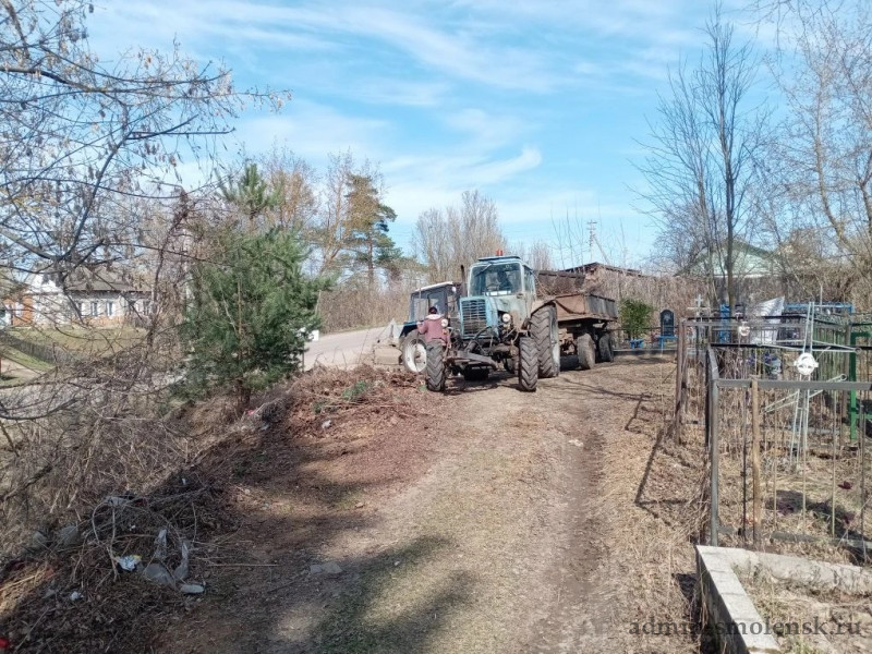 Сотрудники структурных подразделений Администрации округа убирали территорию центрального (старого) кладбища в п. Хиславичи.